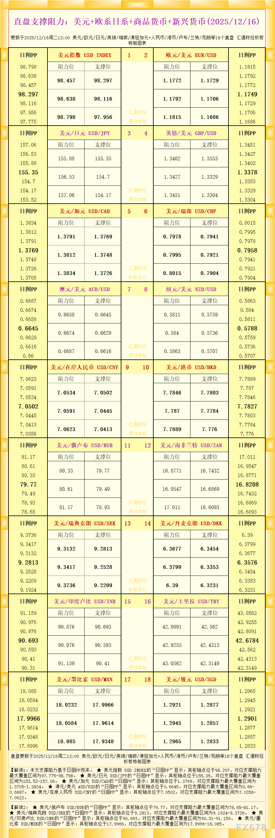 汇通财经APP讯——一张图看直盘支撑阻力:美元+欧系日系+商品货币+新兴货币,更新于2025年12月16日周二13: